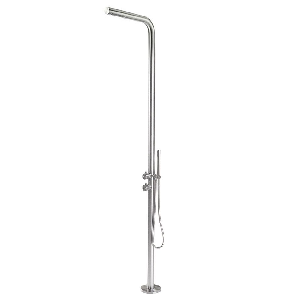 Outdoor shower with diverter, constructed with anti storm rain shower head and handheld hand shower. All external components are made entirely of AISI316. The polished surface prevents oxidation and the build-up of limescale and dirt.